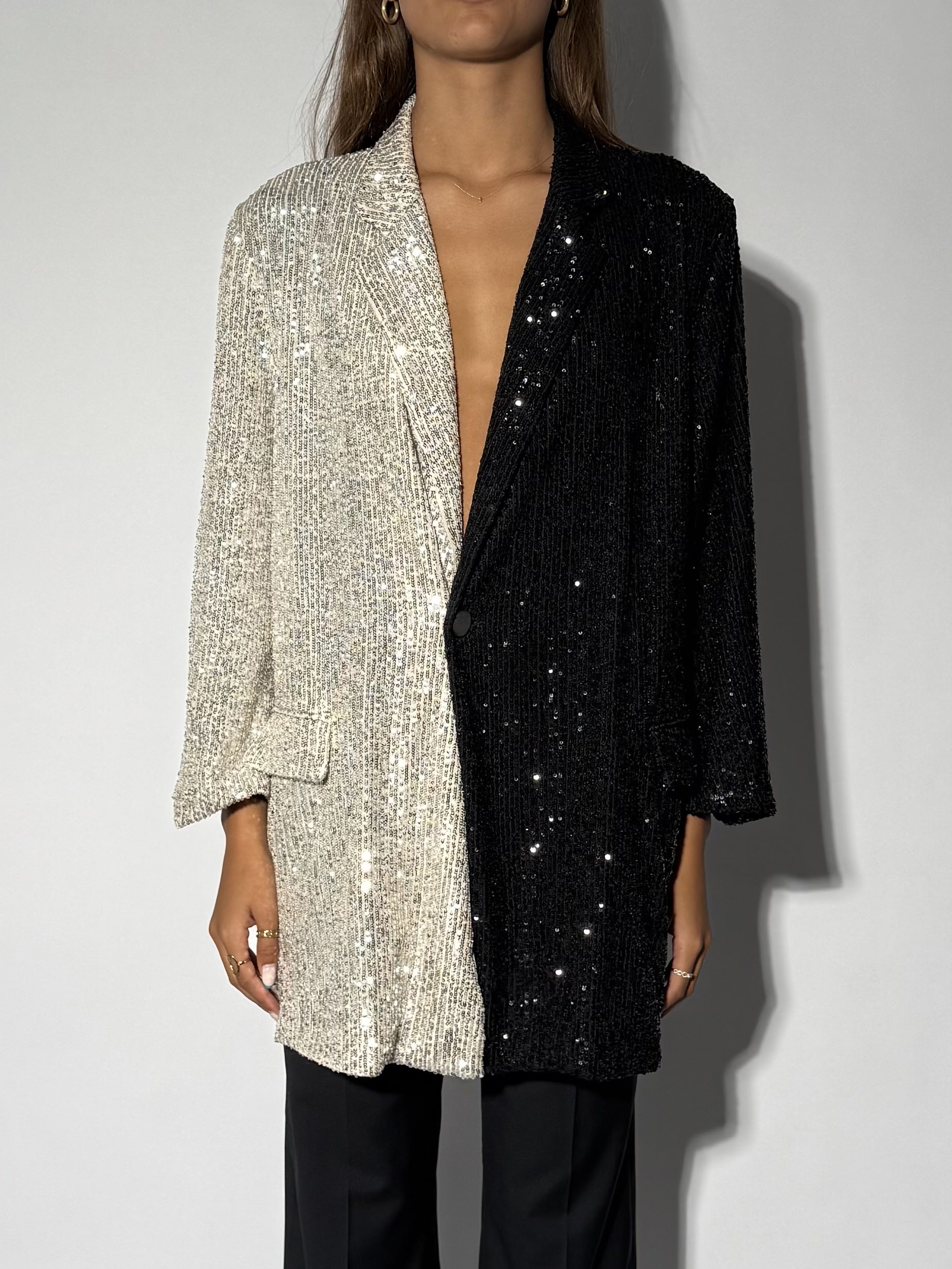 A statement sequin blazer featuring a two-tone palette: black and silver. Designed with a plunging neckline, single-button closure, and lightly padded shoulders. The fully sequined surface creates high-shine drama, perfect for party wear and evening occasions.