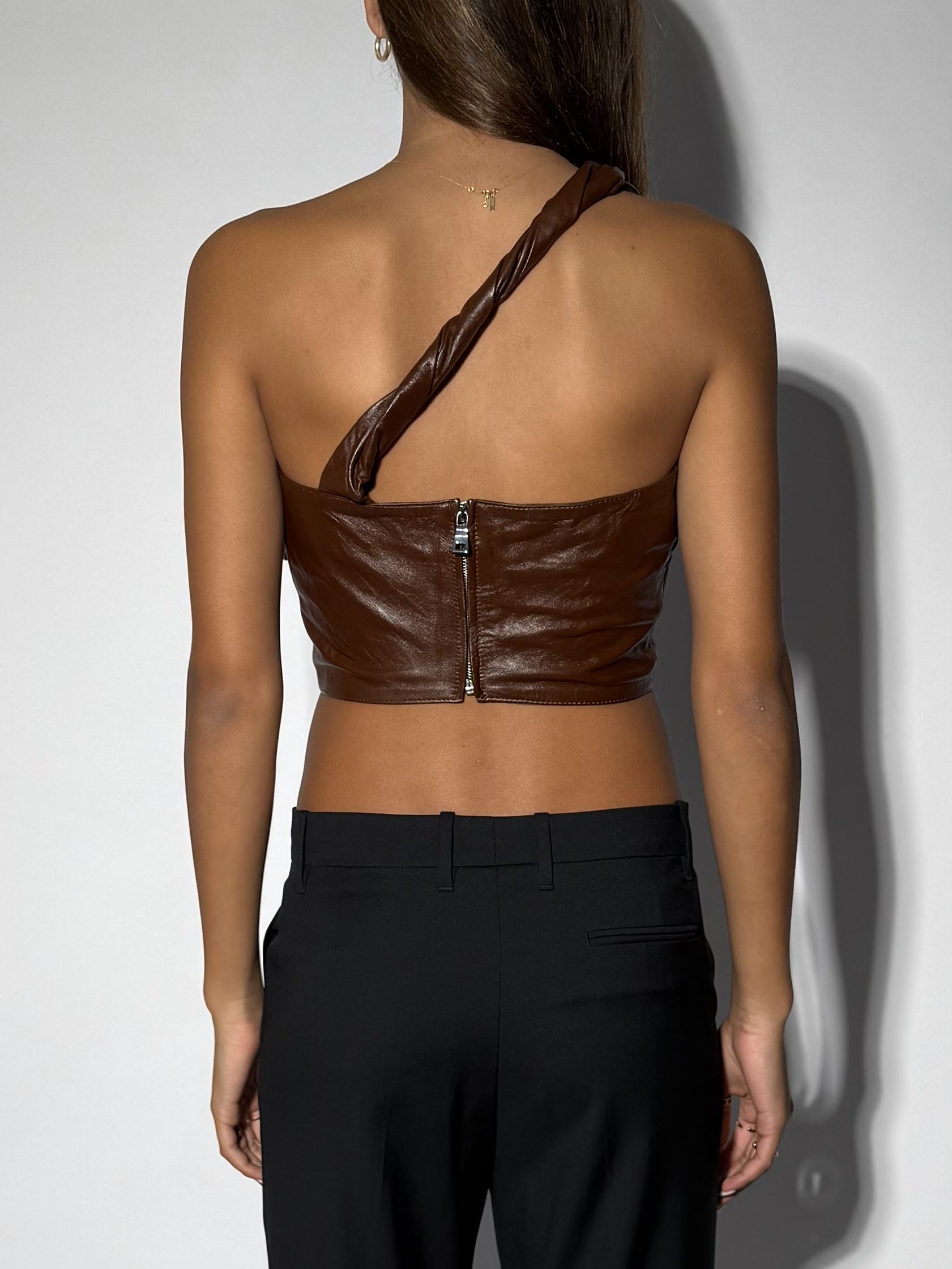 A sleek asymmetric halter top in rich chocolate brown faux leather. The design features a ruched halter strap that drapes diagonally across one shoulder, creating a sculptural and modern silhouette. The structured bodice is softly gathered for shape and fit, balancing edge with femininity. A statement piece that pairs effortlessly with high-waisted skirts, tailored trousers, or denim for bold day-to-night styling.