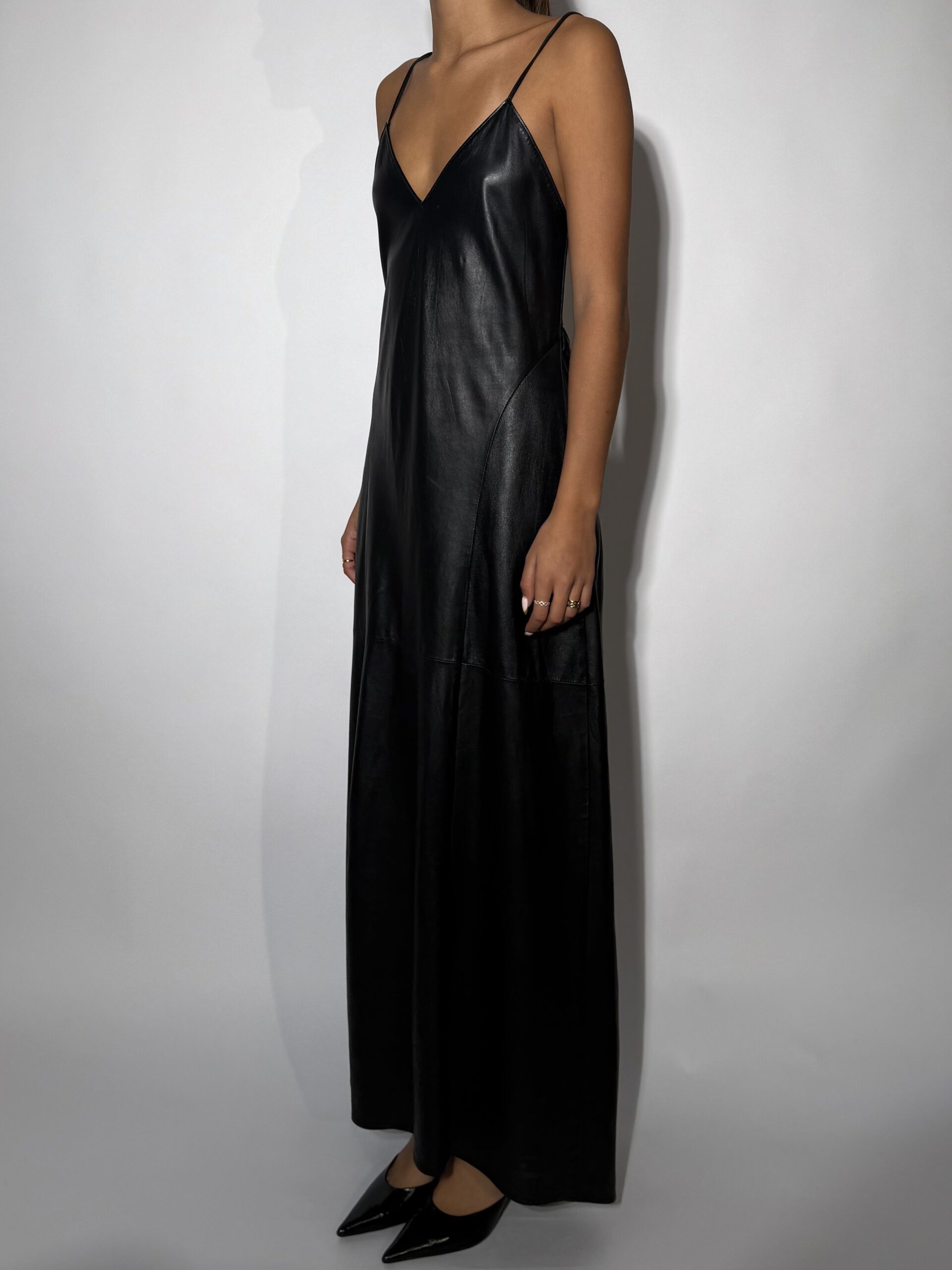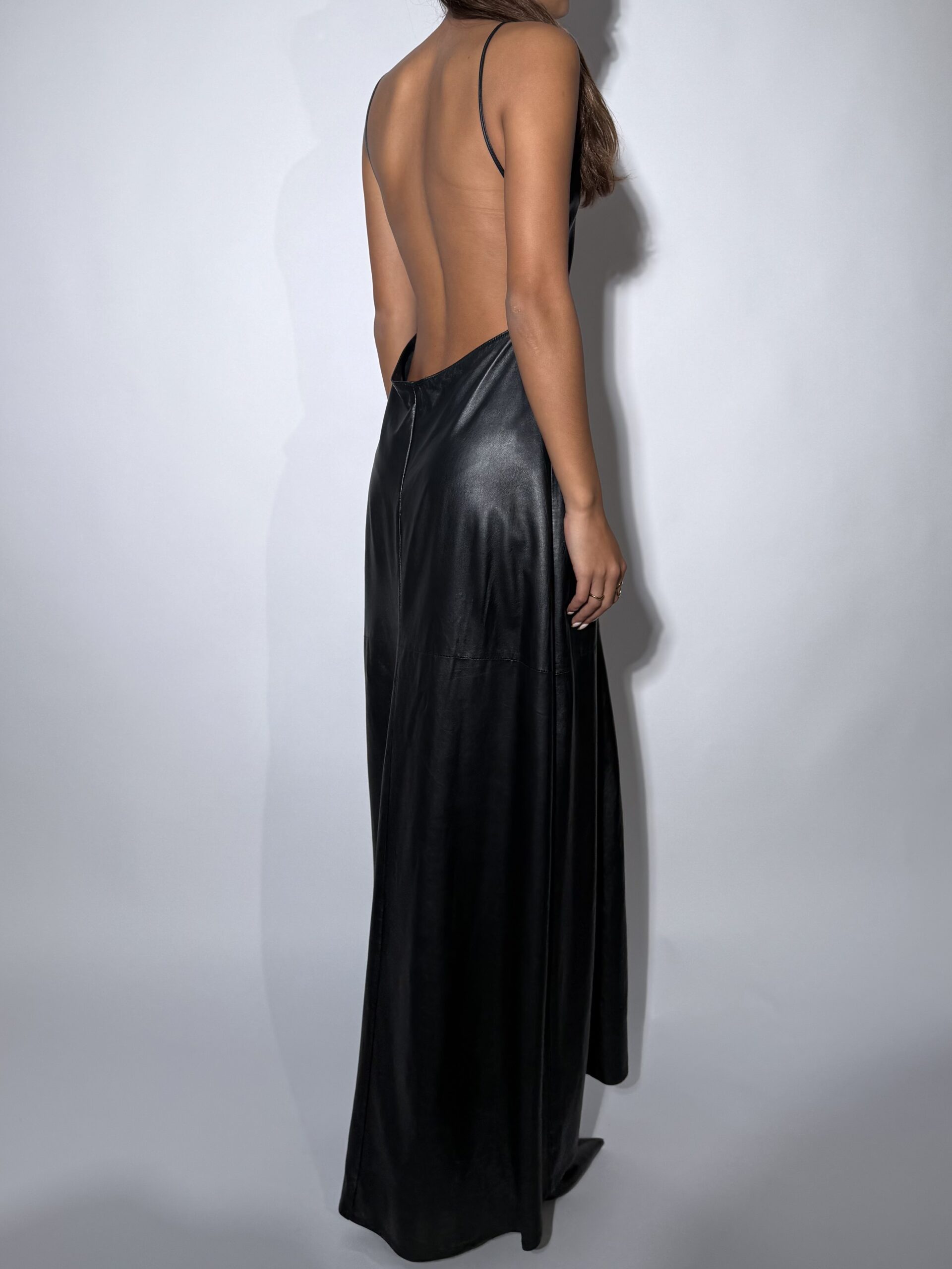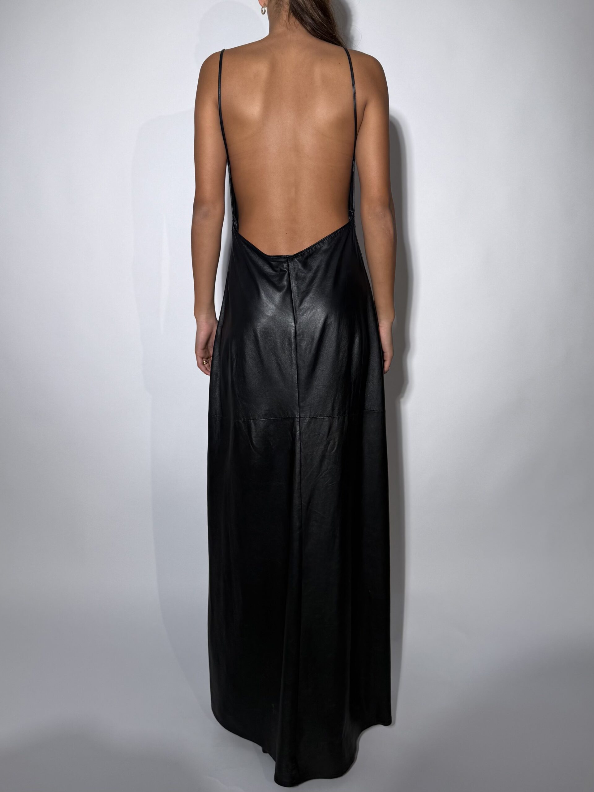 A sleek floor-length slip dress crafted from supple black leather, merging minimalist design with modern sensuality. The fluid silhouette drapes effortlessly over the body, featuring a deep V-neckline and delicate spaghetti straps that highlight the décolletage and shoulders. Precision paneling enhances the natural contours, while the soft sheen of the leather lends an elevated, polished finish. Balancing edge and elegance, this piece transitions seamlessly from day to night—style it with sharp heels for a refined evening statement or layer under a structured blazer for contemporary sophistication.