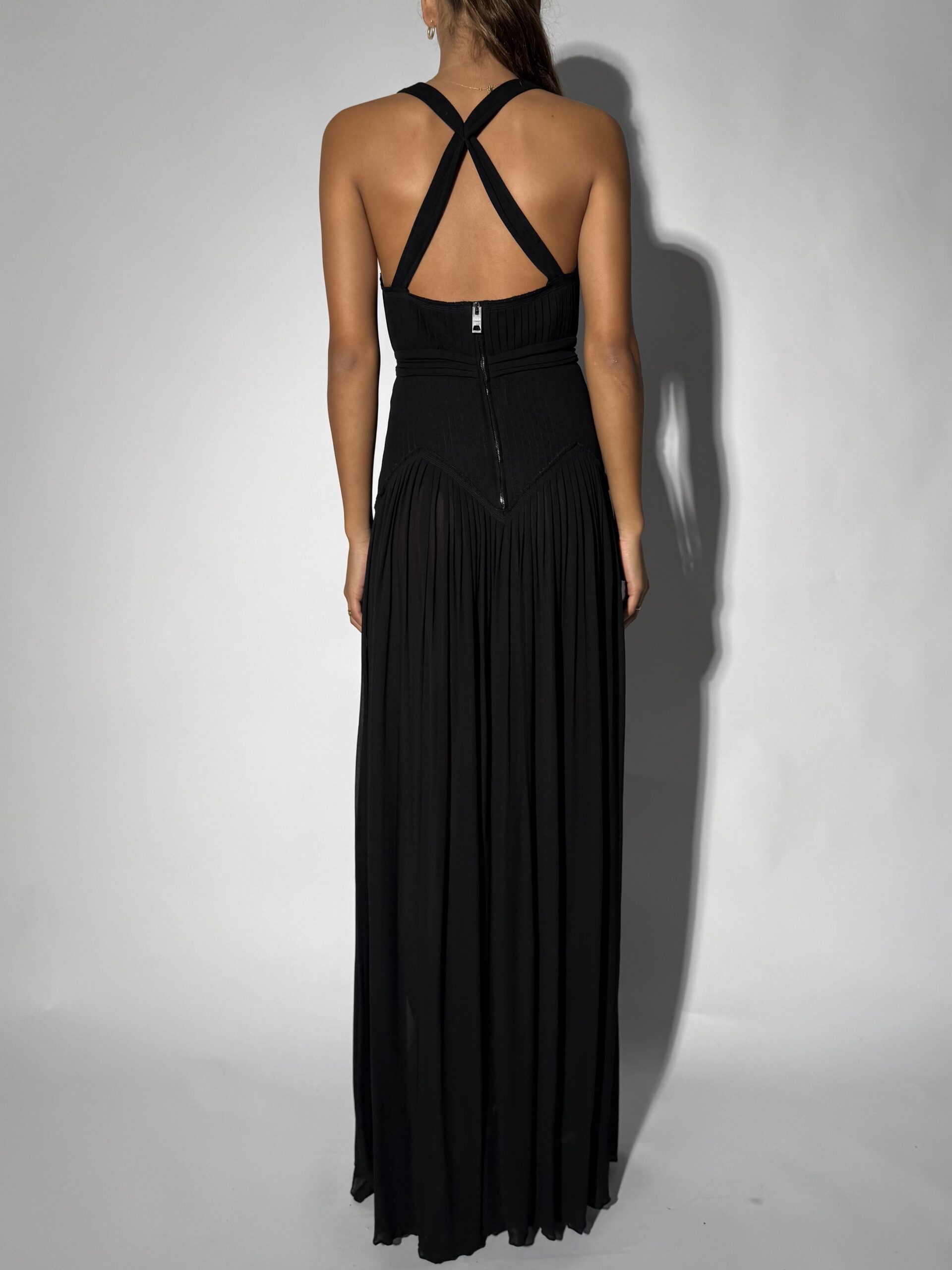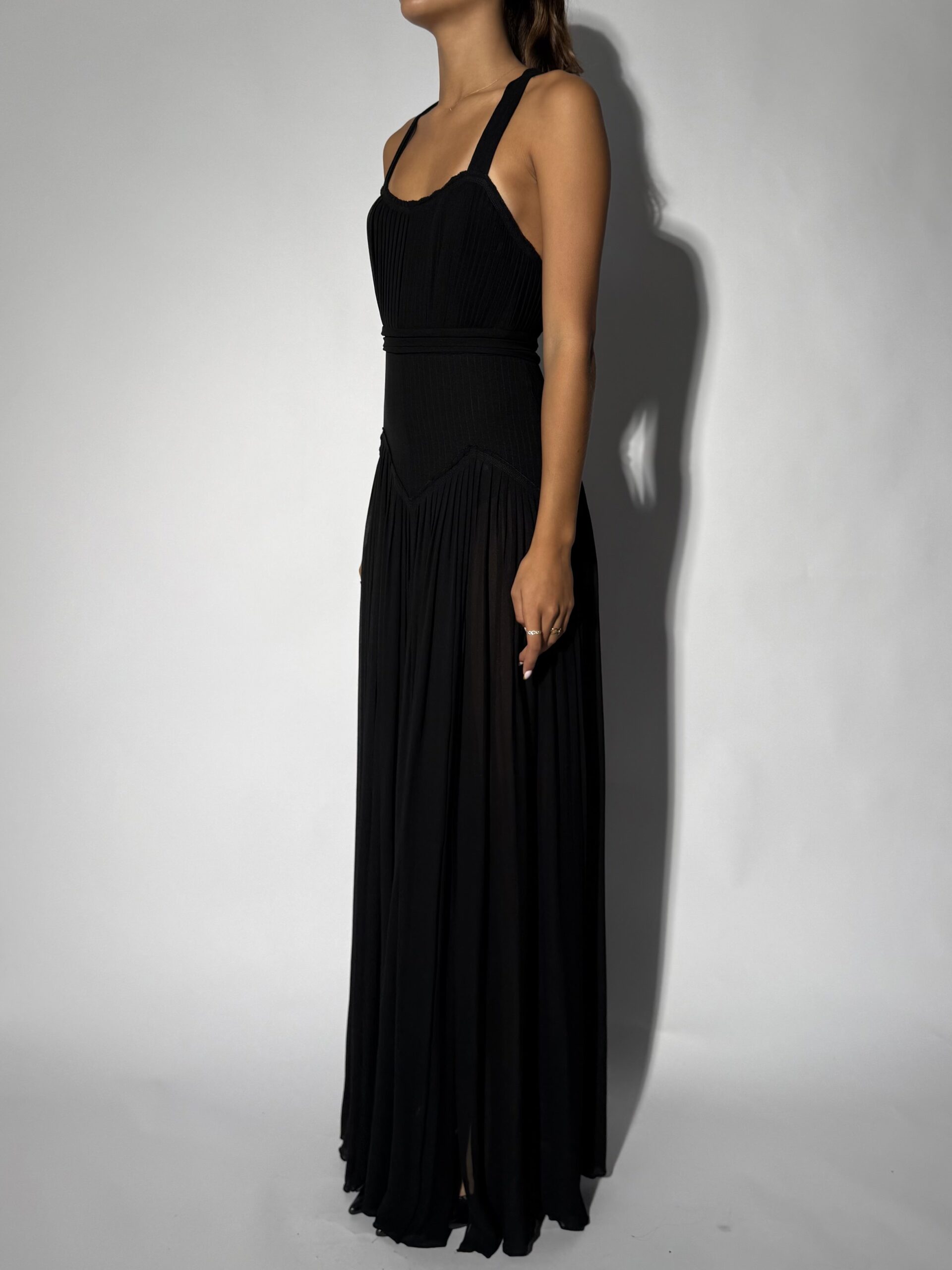 A floor-length black gown defined by its sculptural elegance and fluid movement. The sleeveless bodice features wide straps framing a soft square neckline, with fine vertical pleating that creates subtle texture and elongates the silhouette. A fitted waistband flows into a sharply contoured, V-shaped seam that accentuates the waist before cascading into a full, pleated skirt. A daring high slit along the leg introduces a dramatic edge, balancing the gown’s classical draping with modern sensuality. Finished in lightweight fabric that moves gracefully with each step, this piece embodies a refined blend of strength and allure.