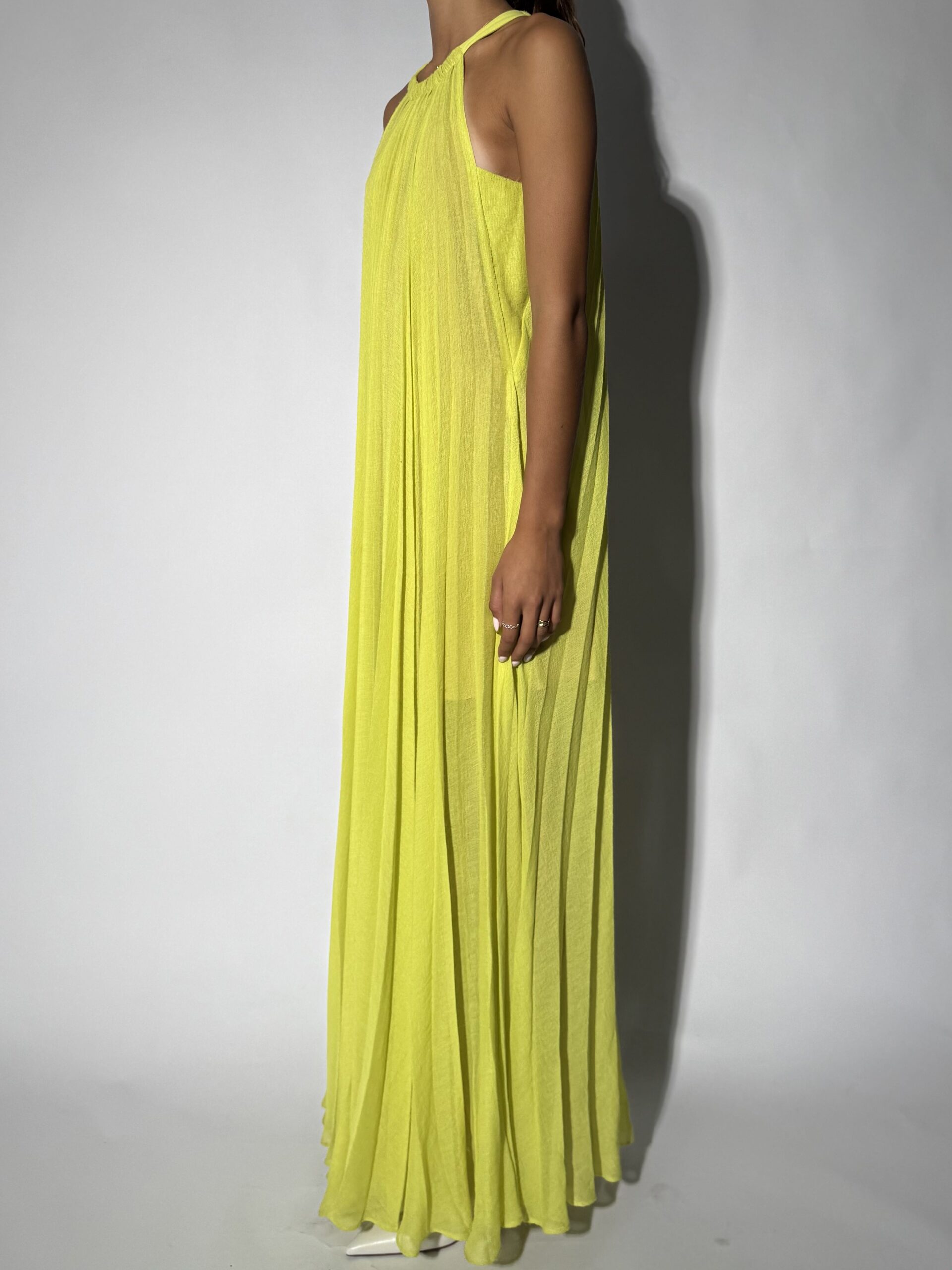 A luminous sleeveless gown crafted from fluid, pleated fabric in a striking chartreuse yellow tone. Designed with a high halter neckline and an elongated, floor-grazing silhouette, the dress falls in soft vertical pleats that create movement and lightness with every step. The relaxed, flowing cut contrasts with the refined neckline, balancing ease with elegance. A statement-making piece, it embodies modern glamour through minimal construction elevated by architectural drape.