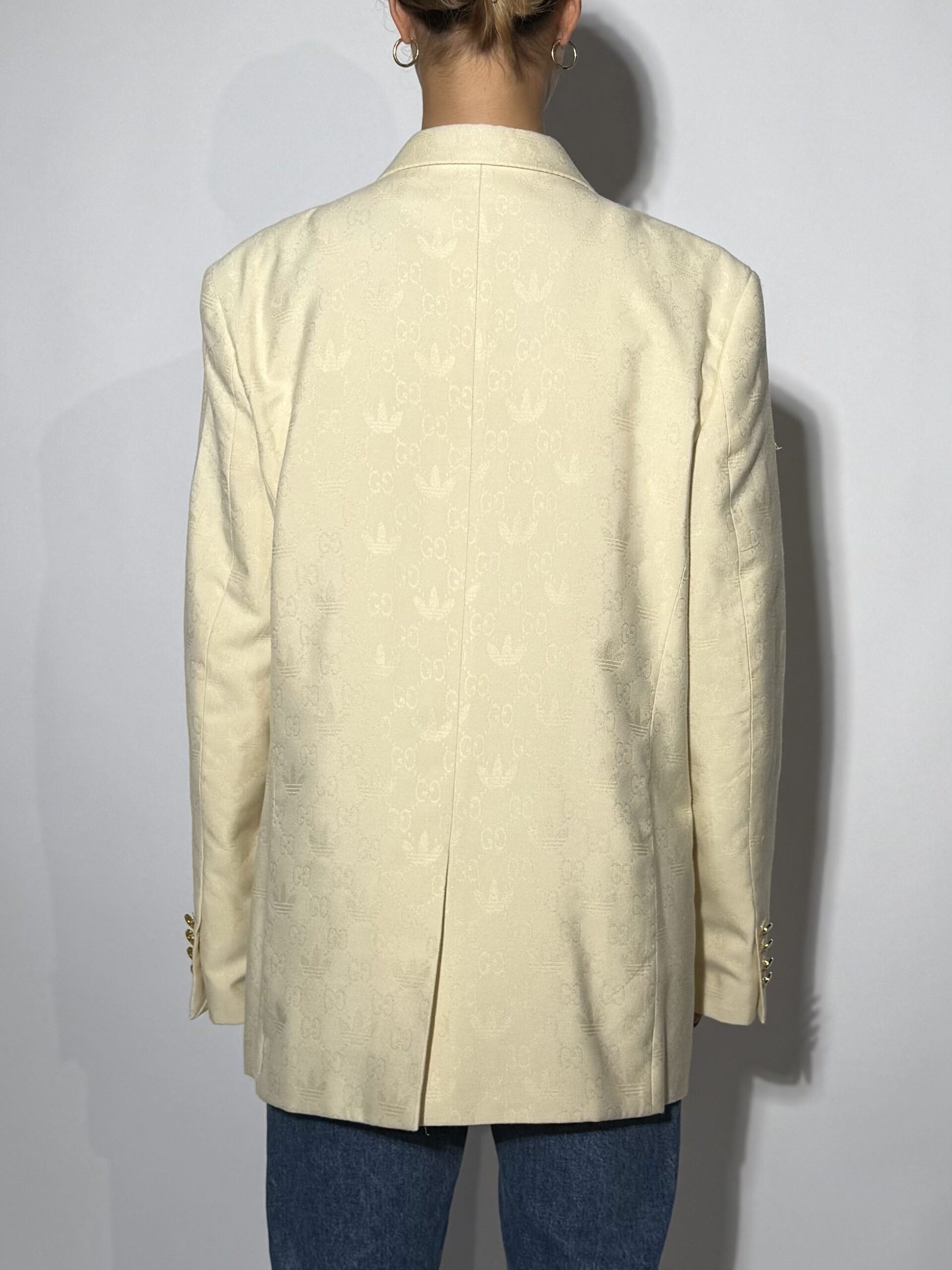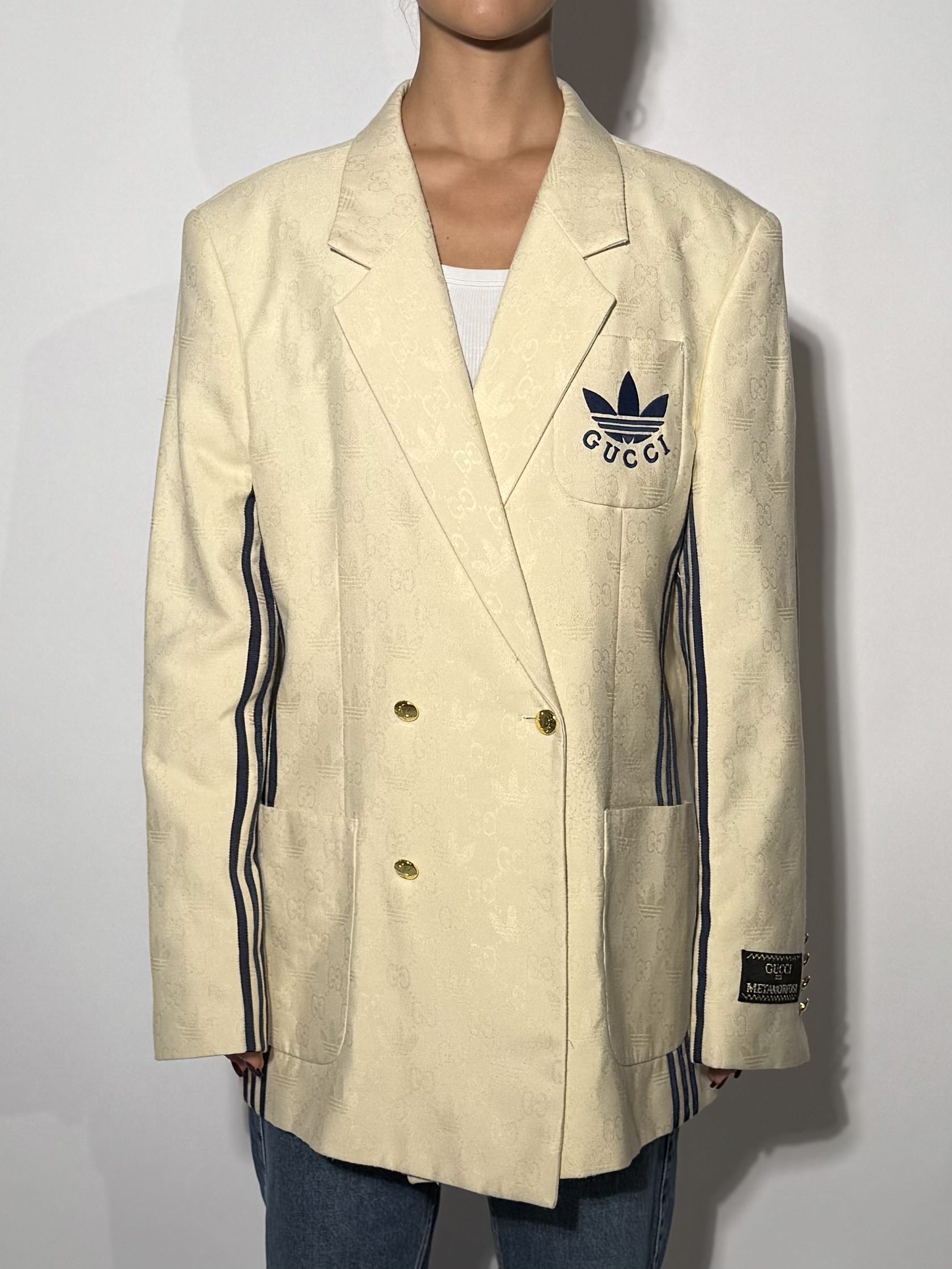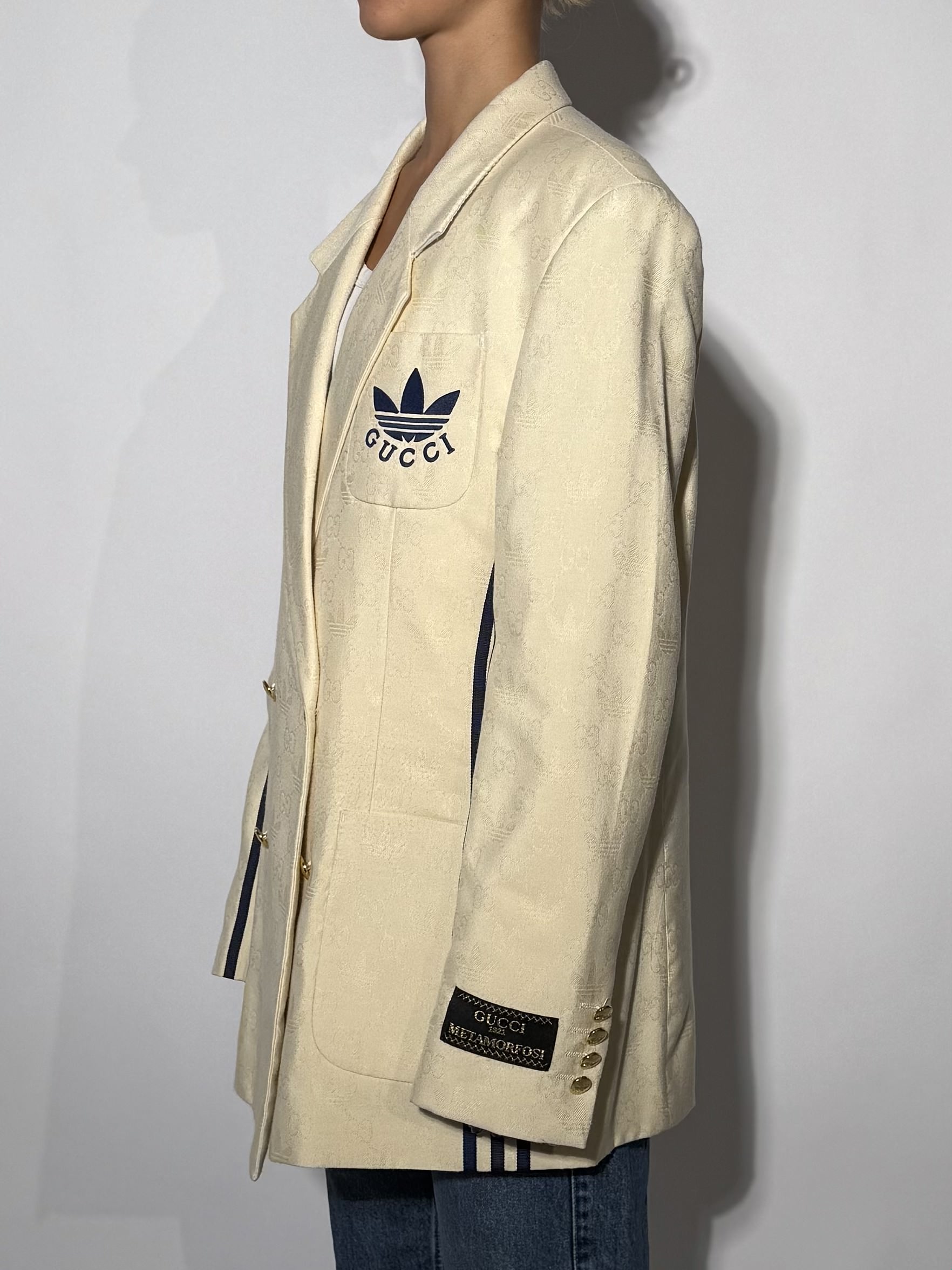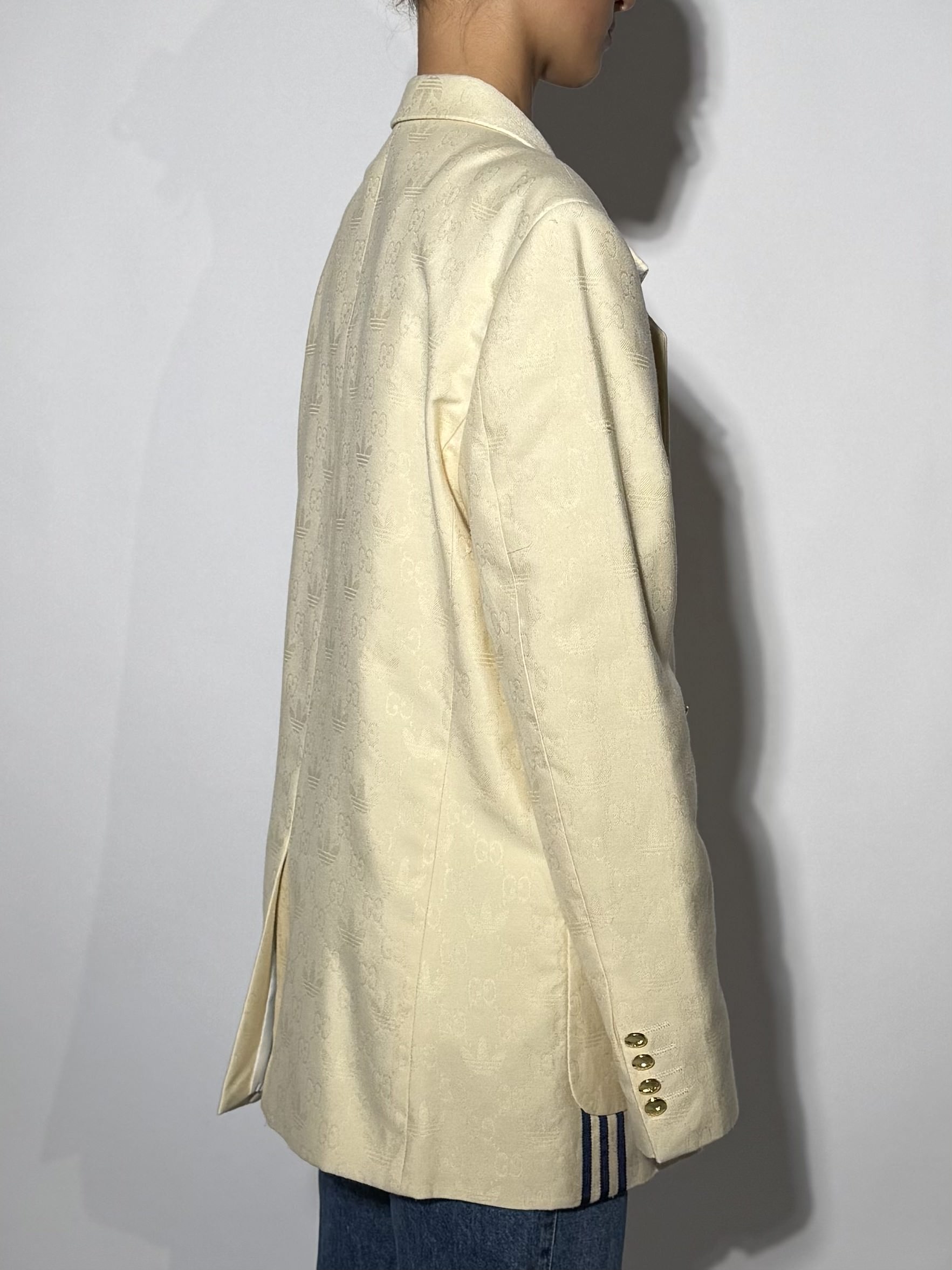 A structured double-breasted blazer in soft cream jacquard featuring the signature monogram pattern throughout. The tailored silhouette combines classic luxury with contemporary streetwear flair, accented by navy adidas stripes running down the sleeves and a collaborative embroidered crest on the chest pocket. Gold-toned buttons add a polished touch, while the relaxed fit and sporty detailing create a striking balance of sophistication and casual edge. Finished with front patch pockets and a logo patch at the cuff, this statement piece embodies the fusion of heritage craftsmanship and modern athletic style.