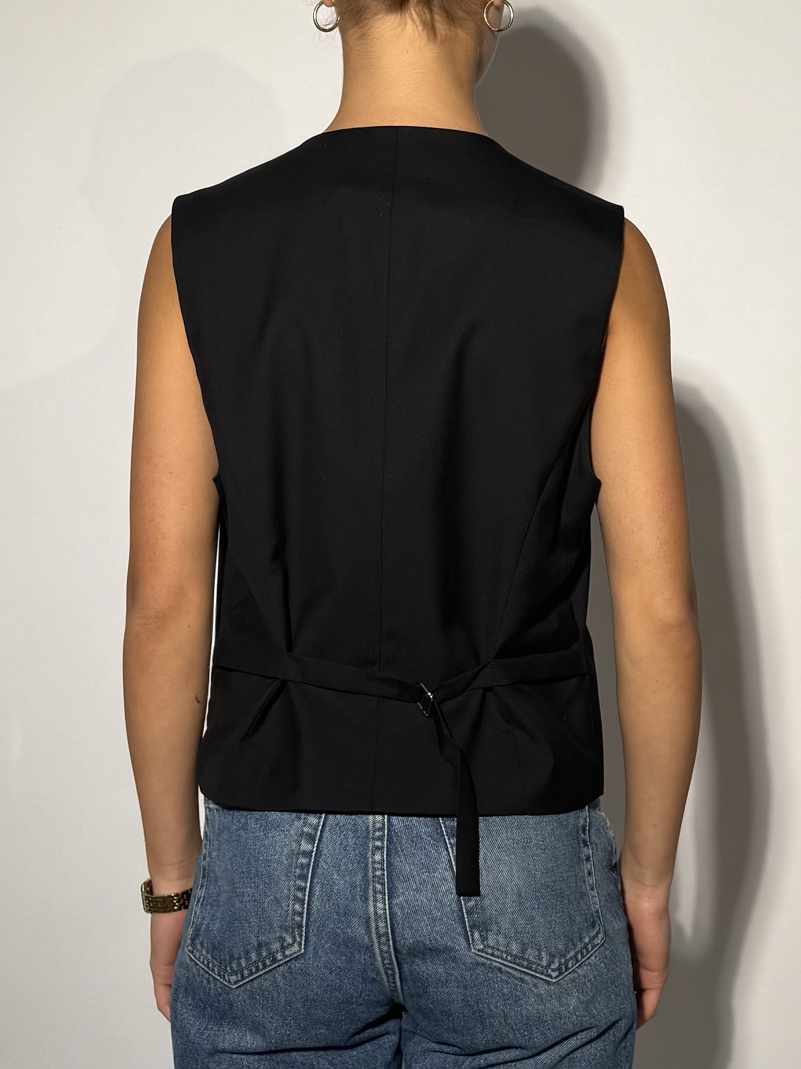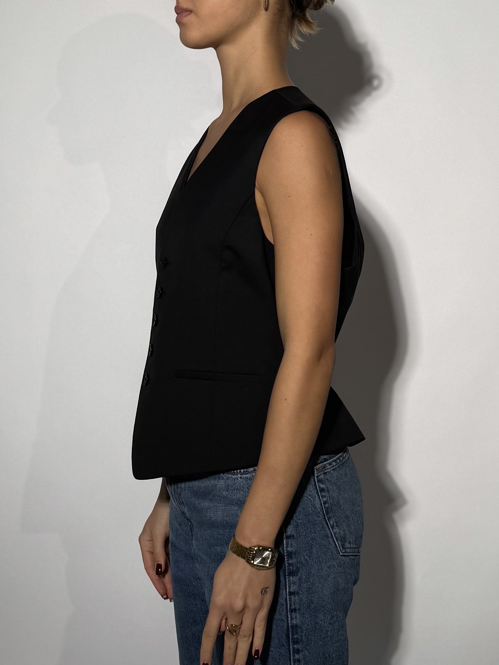 A tailored sleeveless vest in sleek black wool-blend fabric, designed with clean lines and a minimalist silhouette. The deep V-neckline and button-front closure add a touch of classic refinement, while the structured fit flatters the waist for a sharp, modern look. Subtle welt pockets offer understated detailing, balancing sophistication with versatility. Whether worn solo for a contemporary edge or layered under a blazer, this piece captures timeless tailoring with effortless elegance.
